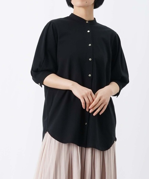 2026 Spring & Summer 【オンオフ兼用で使えるバンドカラー5分袖ブラウス】 ◆Design Tシャツの様な柔らかな素材のバンドカラー5分袖ブラウス。 袖にはタックを入れ、程よくボリュームのあるシルエットに。 カーブした裾デザインが抜け感のある着こなしを演出します。 ヒップにかかるミドル丈で、気になる腰まわりもさりげなくカバー。 ◆Fabric ・ブラック、ホワイトはさらりとしたドライタッチな素材。 ・ブルーは柔らかな表面感のあるストレッチの効いた素材。 ※カラーによって素材が異なります。 ◆color ・オフホワイト、ブラック、ブルーの3色展開です。 ◆Styling ・デニムにキャップ、スニーカーを合わせた大人カジュアルなスタイルに。 ・テーパードパンツと合わせたオフィスカジュアルなスタイルに。 ・ジャンパースカートやサロペットに合わせたスタイルもオススメです◎ -------------------------------- 生地の厚さ:薄手 透け感:オフホワイトのみあり 伸縮性:あり 光沢感:なし 裏地:なし 洗濯:洗濯機使用可(洗濯ネット使用) -------------------------------- 【お買い物をよりお楽しみいただくために】 〇商品のお気に入り登録 完売カラーの再入荷や、完売間近の通知、セールの通知を受けることができます。 〇ブランドのお気に入り登録 新商品や再入荷など、いち早くブランドのお得な情報を受け取ることができます。 【♡をクリック!ご登録お願いします!】