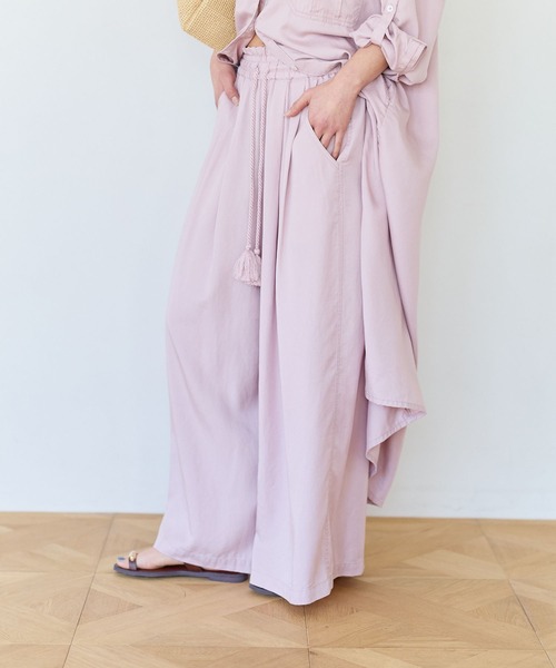 ゆったりとしたシルエットで楽に穿けるワイドパンツ ーーー ★おすすめポイント★ [1]肌触りの良いサラッと素材感 [2]ウエストゴム仕様でイージーな穿き心地 [3]ゆったりめのシルエット [4]ウエストゴムで楽ちん ーーー [fabric] 落ち感のある再生繊維を使用した素材。 バイオウォッシュをし、ステッチにあたり感を出すなど、さらに風合いをよくした生地。 薄手のサラッとした生地感で真夏にもおすすめ。 春らしいモーブピンクカラーがポイント。 [design] ウエストはぐるりゴム仕様のドロストリボンデザイン。 腰周りゆったりのワイドシルエットパンツ。 [styling] ALLアイテムコーデ可能。 半袖シャツ合わせやアソートロゴT合わせもおすすめ。 ※本製品にはTENCEL(TM)ブランドの繊維を使用しています。TENCEL(TM)及びテンセル(TM)はLenzing AGの商標です。 ※屋外での撮影画像は光の加減で実際の商品より明るく見えたり、風合いが異なって見える場合がございます。 商品の色味はスタジオ撮影の画像を参考にして下さい ------------------------------------- ≪お買い物をよりお楽しみいただくために≫ ◆商品のお気に入り登録(ハートマークをクリック) 完売カラーの再入荷通知や、完売間近の通知、セールの通知も受けることができます。 ◆ブランドのお気に入り登録 新商品や再入荷など、いち早くブランドのお得な情報を受け取ることができます。 -------------------------------------