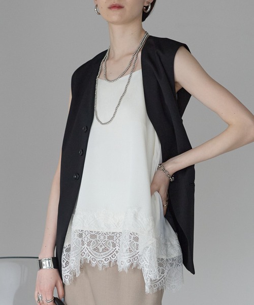 レイヤードで着映える、繊細レースのキャミソール ■Detail トレンドのレイヤードスタイルに欠かせない、裾レースデザインのキャミソールシンプルなトップスにプラスするだけで、コーディネートをぐっと華やかに見せてくれる一枚です 裾には繊細なレースをあしらい、動くたびに軽やかな女性らしさを演出ゆったりとしたシルエットで体のラインを拾いにくく、シャツやTシャツ、ニットの上から重ねてもバランス良く着こなせます 肩紐にはアジャスター付きで、レイヤードするアイテムに合わせて長さの調節が可能インナーとしても使いやすく、コーデの幅が広がる万能アイテムです カラーは、上品で柔らかな印象のホワイトと、コーデを引き締めるブラックの2色展開シーズンレスで着回せる、トレンド感たっぷりのレイヤードキャミです 【おすすめポイント】 ・裾レースがアクセントになり、シンプルコーデを華やかにアップデート・トレンドのレイヤードスタイルにぴったりなデザイン・ゆったりシルエットで体のラインを拾いにくい・肩紐アジャスター付きで長さ調節が可能・シャツやTシャツ、ニットなど幅広いアイテムと好相性・ホワイトとブラックの着回しやすい2色展開 ■Material とろみのある肌触りの良い生地感です 裏地:なし 透け感:ホワイトのみややあり 伸縮性:なし 生地の厚さ:普通 ※詳しいお手入れ方法は商品タグをご参照ください。 【Information】 ◆《お気に入り登録》がオススメ◆ ・「商品のお気に入り登録」で再入荷通知や、ラストの通知、セール通知も受け取ることが出来ます。 ・「ブランドのお気に入り登録」で新商品や再入荷など、お得な情報を受け取ることが出来ます ※撮影時のライティング、ご覧になっているモニター・PC環境により、実際の商品と色味が異なって見える場合がございます。予めご了承をお願い致します。 ※ご注文いただいた予約商品のお届け時期の確認は、注文履歴ページより行えます。