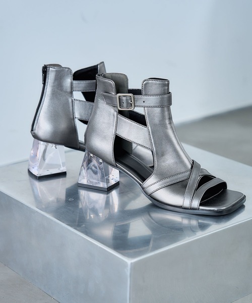 ーーー 独創的なチャンキーヒールとサイドのカットアウトデザイン モードで抜け感を出せるブーツサンダル ーーー point □サイドのカットアウトデザインがポイント □アッパーのクロスストラップとナローベルトがシャープに見せてくれる □着脱が簡単な後ろジップ □ブラック09・シルバー10:涼しげで軽やかな印象のクリアヒール □ブラック系その他15:上品な印象で着用できるエンボスヒール styling シンプルなワントーンコーデに合わせると特徴的なヒールが映えてオススメです。 デニムなどのカジュアルなアイテムに合わせても、ややエッジの効いたスタイルが完成します。 ※加工を施した画像を使用しております。 実物と色味が異なる可能性があるため、色味は詳細後ろにある生地寄り画像を参考にお願いいたします。 あらかじめご了承下さい。