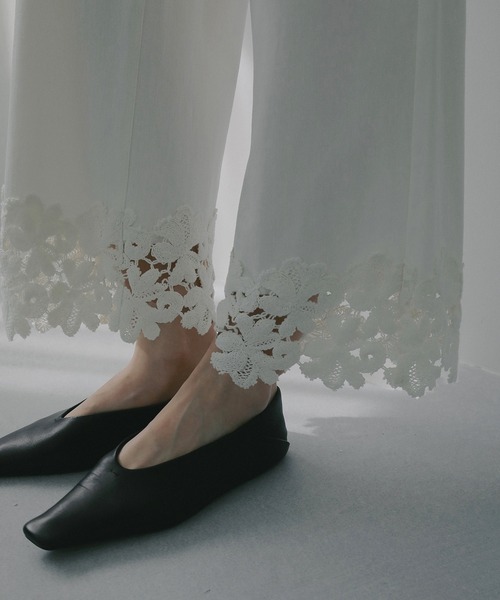 2026 Spring&Summer Collection コットンレースドッキングパンツ 裾のレースがさりげなく華やぐ、ストレートデニム。 ジーンズのパターンをベースにしながら、裾にスカラップ状のコットンレースをあしらったデニムパンツ。 ヒップまわりがすっきりと見えるストレートシルエット。 素材には綿テンセル混のストレッチ性のある柔らかいツイル生地を使用し、快適な穿き心地と上品な表情を両立。 同素材のレースブラウスとセットアップで着ていただくのもおすすめです。 ※裾にレースを配置しておりますので、汚れ防止・裾上げ不要とするため通常のパンツより少し短めのパンツ丈にしております。 ※照明の関係により、実際よりも色味が違って見える場合がございます。 またパソコン・スマートフォンなどの環境により、若干製品と画像のカラーが異なる場合もございますので、予めご了承ください。 商品の色味は、商品拡大画像をご参照下さい。