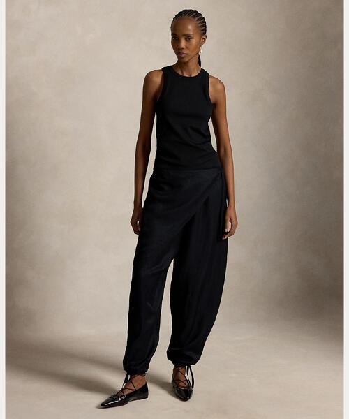 右脚全体にかけて流れるようなラップオーバーレイが際立つパンツ。ウエストとカフスにあしらったスレンダーなセルフタイがリラックス感のあるシルエットを演出。 ・ハイライズ / ゆったりとしたテーパードフィット / くるぶし丈。 ・伸縮性のあるウエスト。 ・右脚を覆い、左ウエストで結ぶラップパネル。 ・ウエスト背面にパッチポケット2つ。 ・両カフスにセルフタイのリボン付き。 ・モデル身長178cm、着用サイズ4。 ※商品の色味は、光のあたり具合など諸条件により色感が多少異なって見える場合がございますので予めご了承下さい。 ポロ ラルフ ローレン