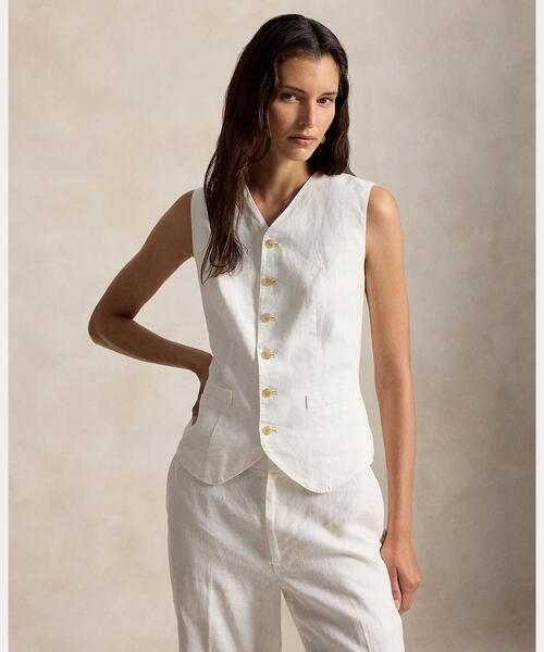 リネン織り地のフロントパネルに薄手のコットンボイルの裏面を組み合わせた、リバーシブル仕様のボタン付きベスト。背面にあしらったバックルのディテールとノッチ付きの裾でアクセントをプラスした、クラシックなテーラードシルエット。 ・ストレートフィット / 腰丈。 ・浅めのVネック / 6つボタンの前立て / 襟と前立てにピックステッチ。 ・フロントウエストに箱ポケット2つ / 前後にプリンセスライン / 背面中央にシーム。 ・背面に調節可能なバックル / 裾にノッチ / 総裏地。 ・モデル身長178cm、着用サイズ4。 ※商品の色味は、光のあたり具合など諸条件により色感が多少異なって見える場合がございますので予めご了承下さい。 ポロ ラルフ ローレン