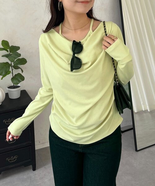 一枚でコーデが完成する、大人のレイヤード風トップス ●インナーと一体化したデザインで、 コーディネートに悩むことなく一枚で洒落た着こなしが完成します ●首元の美しいドレープが、顔周りを華やかでエレガントな印象に演出 ●きれいめスカートでオフィス仕様に、デニムと合わせてカジュアルダウンに、オンオフ問わず活躍する一枚 ●フロントのドレープが気になるボディラインを自然にカバーしてくれるのも嬉しいポイントです♩ -------------------------------------------------------------- 生地の厚さ:普通 伸縮性:なし 透け感:オフホワイトのみややあり 裏地:なし ポケット:なし 洗濯方法:ご自宅での手洗い可能 -------------------------------------------------------------- ※商品画像はサンプルにて撮影をしておりますので、 実際の商品とは色味や仕様・サイズ等が異なる場合がございますので あらかじめご了承ください。 ※商品のお取り扱いに関しましては、商品に付属の アテンションカード、洗濯ネームをご覧ください。 ※撮影場所やお使いのモニター環境により若干お色味が 異なる場合がございます。 特にロケの撮影では明るく見える傾向にございます。 ※サイト上ではフリーサイズの表記ですが、商品タグには Mサイズと表記されている場合がございます。 その場合、ワンサイズでのご用意となりますのでサイズミス などではございません。詳しいサイズはサイズスペックを ご確認いただきますようお願い致します。 ※サイト上でのカラー名とお届けした商品に記載されている カラー名が異なる場合がございますので予めご了承ください。 <返品・キャンセルについて> ・着用・洗濯後の返品は致しかねます。 ・商品到着後、着用前に商品を確認して頂きますようお願い致します
