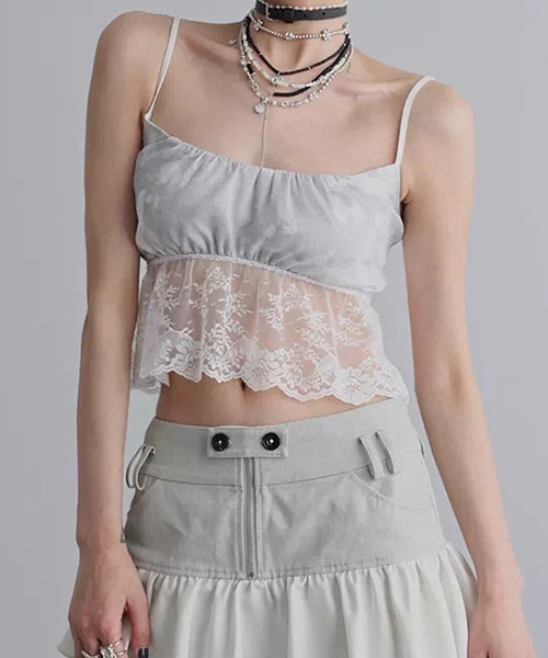 胸元のギャザーデザインと繊細なレース切り替えが印象的なキャミトップス。 軽やかな素材感で、抜けのあるバランスに仕上がる一着。 コンパクトな丈感でハイウエストボトムと相性が良く、着回しの幅が広がります。 【CHENTAITAI】 ジェンダーレスで独創的なデザインをモードに昇華させ、特徴的な生地やディテールをリアルクローズに落とし込んだ、新進気鋭のデザイナーズブランド 詳細補足 仕様:肩紐アジャスター不可、背中ドローコードあり 伸縮性:なし 透け感:裾部分あり 光沢:なし 裏地:あり 厚さ:やや薄手 サイズ感:ややタイト instagram→chuclla_official 取扱注意事項 ※サイズは、測定方法と測定者によって多少の誤差がありますのでご了承下さいませ。 また体型によって、サイズ感に個人差がございます。(平置き採寸) ※商品によってはシワがつきやすく、畳みジワや折りジワなどが強く出る場合がございます。 その際は加湿した風呂場に数時間干すか、スチームアイロンでのお手入れをお勧めしております。 ※生地の素材上、においが気になる場合がございます。 その際は陰干しして頂くと、ほとんど感じにくくなります。 ※レース等の繊細な素材を使用している場合には、お取り扱いにご注意下さい。 ※デニムを使用した製品は、インディゴ染めをしています。 汗や摩擦により移染しやすいので、白色、淡色の組み合わせや重ね着はお避け下さい。 ※ニット素材を使用した製品は、重みで伸びやすくなりますのでハンガーでの保管はお控えください。 ※お洗濯の際には、品質表示の指示に従ってください。必要であれば専門店にご相談ください。 家庭でご洗濯できる商品に関しては、洗濯専用ネットをご使用の上、個別での洗濯をお勧めいたします。 お色物は、色移りする可能性がございます。 ※着用画像は撮影状況や光によって、多少異なる場合がございますので、置き画像をご確認下さい。 ※2023年7月1日より、環境に配慮した取り組みの一環として、紙のアテンションタグを廃止しております。