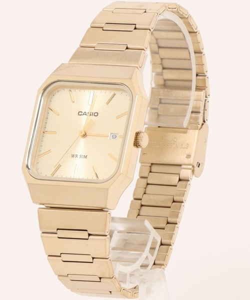 直線が描く、知的なヴィンテージ。 腕元を静かに引き締める、CASIOのアナログ・スクエア。 丸い時計が親しみやすさを与えるなら、四角い時計は知性を象徴します。 世界中で愛されるCASIOのMTPシリーズ。 その中でも、このスクエアフェイスとメタルバンドの組み合わせは特別なオーラを放ちます。 まるで古い映画の主人公が着けているような、クラシカルな美しさ。 手頃な価格帯でありながら、アンティークウォッチのような品格が漂います。 暖かな風を感じて、身軽な春服で出かける週末。 洗いざらしのロンTや、お気に入りのスウェット。 少し肌寒い日に着るトレーナーに、ゆったりとしたバルーンパンツを合わせる。 そんな気取らないカジュアルスタイルに、このメタルの直線がピリッとしたスパイスを与えます。 レイヤードトップスにサッとジレを重ねた、少し背伸びしたコーディネートにも。 足元には歩きやすいスニーカーローファーや、綺麗に磨かれた靴を。 お気に入りのシールを貼ったノートを広げる、カフェでの静かな午後。 そんな何気ない時間も、手元の時計が知的に演出してくれます。 もちろん、大人の日常着としても完璧です。 毎日の通勤で着るセットアップ。 春のハレの日に選ぶ、特別なセレモニーセットアップの袖口にも。 悪目立ちすることなく、誠実でスマートな印象を相手に与えてくれます。 そして、女性の甘いスタイリングを大人っぽく仕上げる引き締め役としても絶大です。 フリルトップスやセーラーカラーといった、ロマンチックなディテール。 キャミワンピースにビスチェを重ねた、トレンド感のある着こなし。 上品なツイードのジャケットに、クラシカルなバゲットバッグを合わせる日。 ふんわりとしたニットやシャギーカーディガンの袖口から、この端正なスクエアフェイスを覗かせる。 甘さと知性が交差するそのバランスが、コーディネートを一段と洗練されたものにしてくれます。 日常のちょっとした水濡れにも安心な5気圧防水。 トレンドに流されず、あなたの腕元で静かに時を刻み続ける。長く付き合える、美しいスタンダードです。 MTP-B185Dは、名作のデジタルカシオをアナログ版に翻訳したような、懐かしさと新しさを併せ持つ腕時計です。8角形の縦長ケースに、薄型ベルトを組み合わせたデザインは、デジタルのチープカシオをほうふつとさせます。 ケースとバンドはどちらもステンレス製で、軽量ながらも耐久性があり、汗や湿気に強く、日常使いにも安心な設計です。 本体とベルトの接続部は、すき間が目立たない構造になっており、一体感のある美しいシルエットに仕上がっています。 文字盤のデザインも秀逸です。 盤面には微細な格子模様が刻まれており、光が当たるたびに立体的で繊細な輝きを見せてくれます。 3時位置の日付枠は、文字盤に溶け込むように設計された、控えめなデザインです。 やや長めの秒針は、カウンターウェイト(針の後ろに伸びた錘)の形状もすっきりと美しく、その動きを目で追うだけでも楽しめます。 アナログにしか出せない針の存在感と、デジタルチープカシオ譲りの親しみやすさを兼ね備えています。 日々のコーディネートに、さりげなく品格を添える一本としておすすめしたい腕時計です。 薄型でシンプルなデザインで、ブレスレットなどのアクセサリーとの重ね付けにも適しています。 ギフトにも喜んでもらえるアイテムではないでしょうか? 自分へのプレゼントにも。。 カジュアルからスーツなどのセットアップスタイルまで、シーンを選ばない一本となっています。 CASIO カシオ 「G-SHOCK Gショック」「Baby-G」「BASIC」「STANDARD」「VINTAGE」「EDIFICE」「PRO TREK」「OCEANUS」などに代表される時計メーカーとして世界で人気の高いカシオは、独創性の高い「世界初の時計」を多く生み出し、その挑戦し続ける開発思想により時計の新しい価値を創造し続けています。 クロックやかけ時計などのラインナップも豊富な、 日本の誇る時計ブランドとして、今後も世界のスタンダードであり続けるでしょう。 ワールドタイムやソーラーシステムなど、特殊機能を搭載したモデルを低価格で実現し、数多くの人々に支持されています。