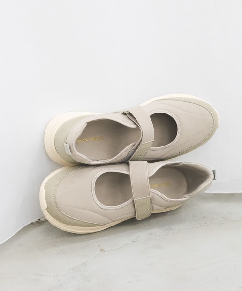 空気のように軽い、エアかるシリーズ ・素材/機能 抗菌防臭 ・デザイン 今季大注目のメリージェーンスニーカー。 メリージェーンのデザインとスニーカーソールを組み合わせることで、程よくカジュアルな、新しいバランスが完成。 日常使いしやすいデザインに落とし込みました。 EVAソールで非常に軽く、インソールのクッションも柔らかいため、まるで素足で歩いているような履き心地です。 ストラップ部分はゴムで伸縮性があるため、歩行時の圧迫感がなく、着脱が楽なのも嬉しいポイント。 素足でサンダル感覚で履くのはもちろん、カラーソックスと合わせて組み合わせを楽しんだりと、色々なバリエーションで履けるデザインです。 パンプスとスニーカーの良いところ取りで、どんなスタイリングにもマッチします。 ・こちらの商品はGLOBAL WORK独自の採寸方法となっています。本サイトのサイズガイドと採寸方法が異なる場合がありますのでご了承ください。 ・お買い物が便利になる機能がたくさん ・商品のお気に入り登録 完売アイテムの再入荷通知、ラスト1点、またクーポンやお値下げ通知をお知らせします。 ・ブランドのお気に入り登録 新商品や再入荷のお知らせ等、いち早くブランドのお得な情報を受け取ることができます。 ぜひご登録ください。
