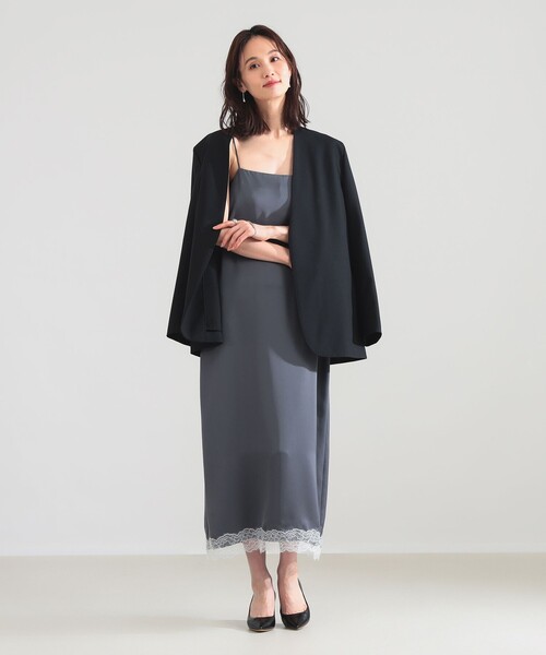 ■デザイン フランスの繊細なリバーレースを裾にあしらったキャミソールワンピース。控えめながらも印象に残る華やかさを演出します。 ■コーディネート ジャケットやカーディガンを羽織ったり、カットソーやニットを重ねたりと、レイヤードスタイルも楽しめます。足元はフラットシューズで軽やかに、ヒール合わせでエレガントにと、オンオフ問わず幅広い着こなしができます。 ■ディテール 肩の共地の細ストラップは長さ調節が可能で、お好みのバランスで着用できるのが嬉しいポイント。裾に施されたリバーレースは、数万本もの極細糸を撚り合わせて織り上げられた繊細な柄が特徴です。後ろ姿に抜け感を添えるバックスリット入り。 ■サイズ 体のラインを拾い過ぎない、落ち着きのある美しいシルエット。裾に向かってほのかに広がるラインが、女性らしいしなやかな動きを演出します。 ■素材 シルクのような上品な光沢を持つポリエステルサテン素材を使用。適度な肉感がありながら軽やかで、タンブラー加工によるナチュラルな表情がデイリー使いにも馴染みます。 ■ケア方法 手洗い可(詳細は商品についている洗濯表示タグをご覧ください。) Model:H171 B80 W58 H86 Size:ONE SIZE ********************** 生地の厚さ:普通 透け感:なし 伸縮性:ややあり 光沢感:あり 裏地:なし ********************** ※光の当たり具合やパソコンなどの閲覧環境によって、実際の色味と異なって見える場合がございます。予めご了承ください。 ※商品の色味は商品単体で撮影した画像をご参照ください。