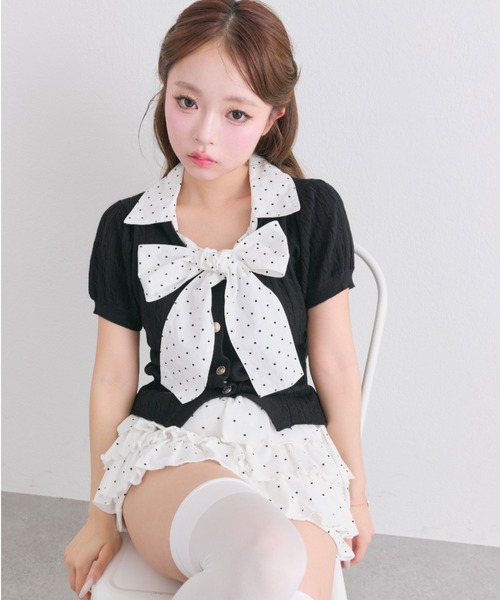 ビッグリボンが主役級のトレンドを詰め込んだニット ■デザイン ・顔周りをパッと華やかにしてくれる、ボウタイリボンがポイント。 ・シャツとニットを重ね着しているようなデザインで、着膨れする心配がなくすっきり着こなせます。 ・ゴールドボタンがアクセントになり、クラシカルな雰囲気を引き立てます。 ・程よい厚みのケーブル編みニットで、さらっと着られる着心地の良さも魅力です。 ■カラー ・ピンク/トップグレー/ブルー/ブラックの4色展開 ■スタイリング ・ミニスカート合わせで王道ガーリーにまとめるのがおすすめ。 ・デニムやスニーカーでカジュアルダウンさせて、甘さを抑えた大人カジュアルもかわいいです。 ----------------------------- 裏地:なし 光沢感:なし 透け感:なし 伸縮性:あり 手洗い:可能 タンブラー乾燥:不可 アイロン:110℃まで ----------------------------- ※着用、お取り扱いの際は、商品についている品質表示とアテンションタグを必ずご確認下さい。 ※ご覧のモニター環境や撮影環境により実際の商品と多少色味が異なって見える場合がございます。ご理解の程よろしくお願いいたします。 ※引っかけ注意 ・粗い組織のものや、表面に凹凸があってルーズな組織のもの 表面に糸が浮き出ているものは、ちょっとした不注意から引っかけてしまいがちです。 取り扱いの際は取り扱い絵表示確認の上、十分注意してください。 ・着用時にベルトや、バックや周囲の壁など表面の粗いものとの摩擦や引っかかりに注意してください。 ・水洗いやクリーニングの際にも他の物ものとの引っかかりに注意して下さい。 ■お気に入り登録のおすすめ 【気になるアイテムを登録】 ハートをクリックしてお気に入りに登録すると 完売カラーの再入荷やラスト1点の通知、セールの通知を受けとることができます。 【ブランドを登録】 新商品や再入荷、セール通知など、いち早くブランドの情報を受けとることができます。