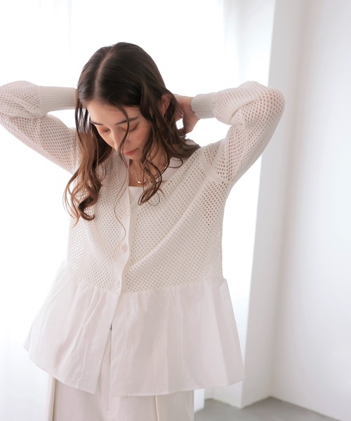 メッシュ編みペプラムカーディガン 表情豊かなメッシュ編みと、軽やかなシアー素材を組み合わせたペプラムカーディガン。 身頃は程よい透け感のあるメッシュ編み、裾部分はエアリーなシアー素材を使用し、奥行きのあるデザインに仕上げました。 Vネックデザインが顔まわりをすっきりと見せ、ペプラムシルエットでも甘くなりすぎないバランスに。 ふんわりと広がる裾が腰まわりを自然にカバーし、体のラインを拾いすぎずきれいなシルエットを演出します。 羽織るだけでスタイリングに軽やかさと華やぎをプラスしてくれる一枚です。 ■Point ・表情のあるメッシュ編みデザイン ・裾は軽やかなシアー素材を使用 ・すっきり見えを叶えるVネック ・甘くなりすぎないペプラムシルエット -------------------------------------- 透け感:あり 裏地:なし 伸縮性:あり ケア方法:手洗い可 ※お洗濯の際は洗濯表示を必ずご確認ください。 --------------------------------------