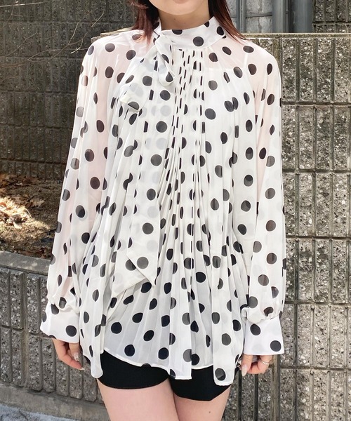 Narcissus/ドットプリーツブラウス 【ポイント】 軽やかなシフォン素材にドット柄をあしらった華やかなブラウス。首元のリボンディテールが上品なアクセントとなり、フェミニンさとモード感を兼ね備えた一枚です。動くたびに揺れるシフォンの軽やかな表情が、コーディネートに華やかさと抜け感をプラスしてくれます。 【デザイン・シルエット】 フロントにはタックデザインを施し、立体感のある美しいシルエットに。さらに背面にはプリーツを入れることで、動きのあるエレガントな印象に仕上げました。ゆったりとしたドルマンスリーブが女性らしい柔らかなシルエットを演出し、身体のラインを拾いにくいのも嬉しいポイント。ボリュームのあるデザインながらも、軽やかなシフォン素材で抜け感のあるスタイリングが叶います。 【おすすめのスタイリング】 タイトスカートやスラックスと合わせたモードなスタイリングはもちろん、ショートパンツやミニボトムと合わせたトレンド感のある着こなしもおすすめ。トップスにボリュームがあるため、細身のボトムと合わせることでバランスの取れたスタイリングに。パンプスやロングブーツと合わせれば、より洗練された印象に仕上がります。デニムとスニーカーでカジュアルダウンしたデイリーコーデも◎ 【素材】 軽やかで柔らかなシフォン素材を使用。 程よい透け感が女性らしさを引き立て、動くたびに美しいドレープを生み出します。 --------------------------------------------------------- ▼ 商品のお気に入り登録 ▼ 完売カラーやサイズの再入荷、残り1点、セールなどの通知を受け取ることができます。 ▼ ブランドのお気に入り登録 ▼ 新商品や再入荷、ショップのおすすめトピックスなど、いち早くブランドの情報を受け取ることができます。 --------------------------------------------------------- ※ご覧のモニター環境や撮影環境により実の商品と多少色味が異なって見える場合がございます。 ※掲載画像の商品の色味は、屋外や屋内の光の照射や角度により実物と色味が異なる場合がございます。また表示のサイズ感と実物は若干異なる場合もございますので、予めご了承ください。 ※他のキャンペーンにより、期間中に価格が変動する場合があります。 ※セールは予告なく終了させていただく場合もあります。 【Narcissus/ナルシス】 NO! CONCEPT, NO! RULE just our formula of mixture 日常にラグジュアリーとエッジを効かせ、 境界線を持たず、自由に選ぶ。 今日を、自分らしく着るために。 Not here to please. Only to express.