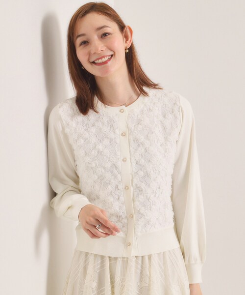 【デザイン】 立体感のあるチュールレースが高見えしてくれる。 オケージョンシーンにも活躍する華やかカーディガン。 フロントの立体レースが華やかなニットカーディガン。 レース生地の上にチュールの花レースが重なった立体感のある生地を使用。 レース部分は薄手のシフォン生地を重ね、透け感を抑えた仕様にしています。 ボタンはゴールド縁のパール調ボタンをあしらい輝きをプラス。 フロントを閉めてプルオーバー風に着こなすのもおすすめです。 【素材】 レーヨン混の柔らかな着心地のニット素材。 フロント部分はレース生地とシフォンの2枚重ね仕様。 ※照明の関係により、実際よりも色味が違って見える場合があります。また、パソコン・スマートフォンなどの環境により、若干製品と画像のカラーが異なる場合もございます。 ---------------------------------------- ★お気に入り登録がおすすめ★ ▽気になる商品はハートマークをクリック! ・再入荷やセールの通知をお知らせ ・お気に入り一覧からいつでもチェック ▽ブランドのお気に入り登録も! ・新商品やお得な情報をいち早くお知らせ ---------------------------------------- モデル情報:身長171cm B80 W59 H88 着用サイズ:00(フリーサイズ) 店舗へのお問い合わせ商品番号:P93-35005 ●製品寸法: 00(フリーサイズ):着丈48cm B94cm 袖丈58cm 肩幅35cm 備考: