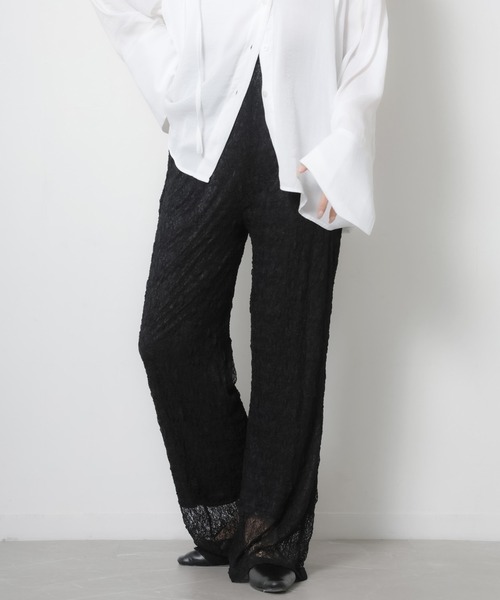 【Riberry シアーレースパンツ】 \シンプルコーデに映える一枚/ 程よい透け感で大人っぽく着こなせるレースパンツ♪ ■Styling 繊細なレース素材がコーディネートに華やかさをプラスするシアーレースパンツが登場しました。 軽やかな透け感がシーズンムードを高め、シンプルなスタイリングにも抜け感を演出してくれる一着です。 ウエストはゴムなのでストレスフリーで着用可能◎ 長時間の移動や、旅行、楽だけどオシャレに見せたい場面にもおすすめです! 同素材のレースシャツ【RV-0009】と合わせれば、トレンド感のあるセットアップスタイルも楽しめます♪ セットアップでの着用はもちろん、それぞれ単品でも着回ししやすく、幅広いスタイリングに活躍するアイテムです。 コーディネートは、シンプルなタンクトップやキャミソールと合わせたヘルシーなスタイルが相性抜群! Tシャツやシアートップスと合わせてカジュアルダウンした着こなしも◎ オーバーサイズのシャツやジャケットを羽織れば、こなれ感のある大人カジュアルスタイルに仕上がります! 足元はサンダルやミュールで抜け感を出すのはもちろん、スニーカーを合わせてラフにまとめるのもおすすめ。 デイリーからリゾートスタイルまで、幅広いシーンで活躍する一着です! ■Detail ウエストは総ゴム仕様でストレスフリーな着心地。 リラックス感がありながらも、すっきりとしたストレートシルエットで大人っぽく着こなせるバランスに仕上げました。 動くたびに揺れるレースの表情が、コーディネートにさりげない華やかさをプラスしてくれます! ■Material 素材にはナイロンとポリウレタンを混紡したレース生地を使用。 柔らかな風合いとほどよい伸縮性があり、見た目の繊細さとは裏腹に快適な穿き心地に仕上げています。 レース特有の立体感のある表情がスタイリングに奥行きをプラスし、女性らしい上品な印象に。 裏地にはポリエステル製のさらっとした素材を使用しており、透け感を楽しみながら安心して着用できる仕様。 足首上あたりまでの裏地丈にすることで、裾部分は程よく透けるデザインになっており、軽やかで抜け感のある足元を演出します。 通気性も良く、さらっとした肌触りでロングシーズン着用できるのも魅力です♪ ▽生地感 透け感:あり 〇〇●〇〇 なし(オフホワイトややあり/淡色のインナーのご着用を推奨しております。) 生地の厚さ:厚い 〇〇〇〇● 薄い 裏地:あり 伸縮性:あり ※この商品は製品非常にデリケートな素材を使用しております。ご使用の際、アクセサリー等のひっかけに十分ご注意ください。 ※この素材は性質上、発汗、摩擦等により、ほかの衣料やバッグなどに多少色落ちや色移りする場合がありますので、十分にご注意下さい。 ※商品の梱包には細心の注意を払っていますが、通販の特性上、到着時に畳みシワがついている可能性がございます。予めご了承ください。 ※お肌のデリケートな方は刺激を感じる場合がございます。 ※詳しいお手入れ方法は商品タグをご参照ください。 【Information】 ◆《お気に入り登録》がオススメ◆ ・「商品のお気に入り登録」で再入荷通知や、ラストの通知、セール通知も受け取ることが出来ます。 ・「ブランドのお気に入り登録」で新商品や再入荷など、お得な情報を受け取ることが出来ます ※撮影時のライティング、太陽光、ご覧になっているモニター・PC環境により、実際の商品と色味が異なって見える場合がございます。予めご了承をお願い致します。