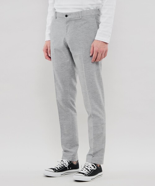 <素材> 国内莫大小の特殊なハイゲージジャガード機にて超度詰に編み立てた、布帛さながらのコンパクト感、軽さと、ジャージ本来のストレッチ性を持ち合わせたデニム風素材です。 <デザイン> FLEX JERSEY(フレックスジャージー)シリーズ ジャージー素材を使いながら、テーラリングの技術を活かし仕立てた、リラックスしながらもきちんと感を兼ね備えたセットアップシリーズです。カジュアルジャケット(品番:G1E27792)と共地になり、セットアップでのご着用がおすすめのパンツです。