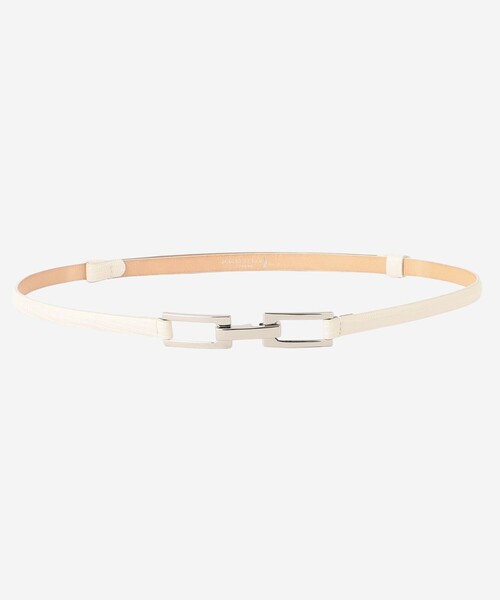 スクエアの形状のビット金具がポイントの10㎜巾の細ベルトです。白(#03)、ベージュ(#40)、グリーン(#70)は艶とカラーの美しいリザード型押レザーを使用しております。黒(#09)にはマットで落ち着きのあるサフィアーノ型押レザーを使用しています。いずれも型押で傷が付いても目立ちにくくなっています。金具のフックをもう一方の角カンにひっかけて着用できます。背後のレザーをスライドさせて自由にサイズ調節出来るアジャストベルトで、ワンピース、スカート、パンツやアウター、ストールの上からなど様々なスタイルに合わせやすくなっています。