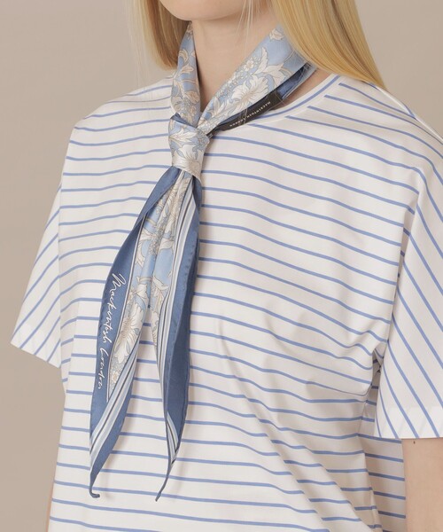 <BIBURY FLOWER/バイブリーフラワー> イギリス、バイブリー村の花々が咲き誇る美しいイングリッシュガーデンをイメージし、規則性のあるシンメトリックで大胆な柄を緻密に描写したブランドオリジナルのフラワープリントです。MACKINTOSH LONDONでは上品で大人のやさしいモチーフを「BIBURY FLOWER/バイブリーフラワー」と称しシーズンに合わせたモダンなアレンジで大切に使用しています。 アイコンであるバイブリーフラワープリントのダイヤモンドシェイプスカーフです。定番サイズより一回り小さいサイズにしています。上品な光沢のある12匁シルクツイルを使用。首に1回結んで垂らしたり、二重巻にして短く結んだりとアレンジして着用いただけます。また、バッグや帽子に結んだり、ヘアアクセサリーとして髪に結んでも。熟練した職人が手捺染で丁寧にプリントしています。また、出来る職人がほぼいないとされるバイヤス地の手巻きを、職人が希少な技術で手巻したMADE IN JAPANのスカーフです。