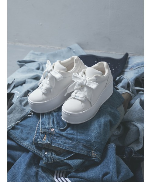 【密かに盛れる…美脚インソールスニーカー】 【Design】 8cmのソールに加え4cmのインソールを忍ばせた、密かにスタイルアップが叶う計12cmソールの美脚スニーカー。 切り替えを抑えたミニマルなデザインで、 どんなコーデにも自然となじむ一足に。 なめらかなヌバック生地が足元を上品にまとめ、 カジュアルになりすぎない絶妙バランス。 ふんわりとした太めのシューレースは、きゅっと結べば リボンのようなシルエットに♡ 同色で仕上げたさりげないDDロゴがどんなコーデの邪魔をする事なく ダーリッチらしさをプラス◎ 足元から“盛れる”フェミニンカジュアルを演出してくれます…♡ ソール:約8cm ストーム:約5cm インソール:4cm 【Styling】 ミニ丈に合わせて、すらっとした縦ラインを強調できます。 ロング丈でもバランスよく脚長見え◎ デニムやスウェットに合わせてもカジュアルすぎず、きれいめな印象にまとまります。 【Fabric】 きめ細かく、やわらかなヌバック素材を使用。 マットな質感が足元にやさしい雰囲気を添え、 カジュアルになりすぎない上品な印象に仕上げます。 ふんわりとしたタッチで、どんなコーデとも自然になじむ一足に仕上げました♡ 足元を軽やかに彩るホワイト1色展開。