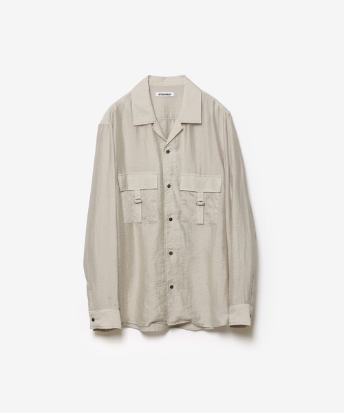 上品な光沢感を纏ったローン地のオープンカラーシャツ ■素材 シルクとキュプラ糸を混紡した柔らかな落ち感のあるローンを使用。 ローンとは薄手で軽量な平織り素材。 上品な光沢感・艶感を持ち、ソフトで滑らかな肌触りを持ちます。 平織りですので、薄手ながら適度なハリ・コシがあるのも特徴です。 暑い日でも、涼しくサラッと羽織れる素材感。 ■デザイン 上質な光沢感を纏ったローン素材を使用したオープンカラーシャツ。 フロントの立体的なポケットが印象的。 適度なハリ感のある素材を使用しているので、羽織としても使いやすいシャツ。 【ATTACHMENT / アタッチメント】 99年に熊谷和幸により”ATTACHMENT”が設立。 服を、着る人の魅力や個性、内面を引き出す“付属”として捉え、 シルエットの計算と、素材使いから生まれる着心地の良さ、 クラフツマンシップが叶える緻密な仕立て、 ディテールをそぎ落としたシンプルで普遍性のあるウェアを提案しています。