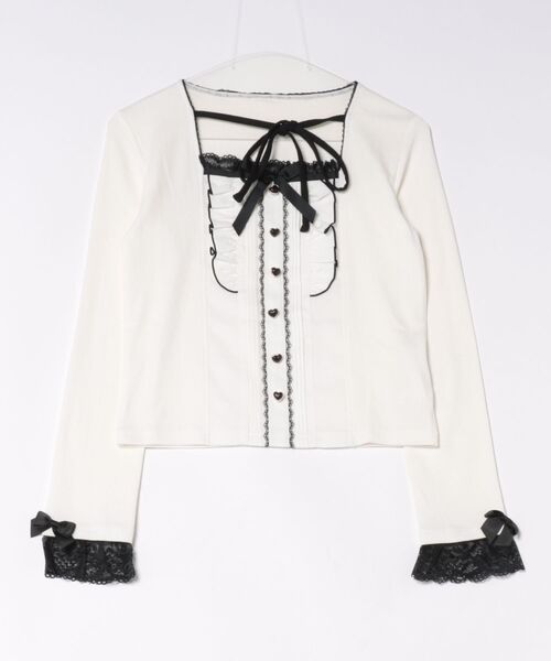 フロントに並んだハートボタンや胸元で結ぶリボンが可愛いポイント!袖口には配色のレースとミニリボンを添え、シーハニらしくガーリーに♪