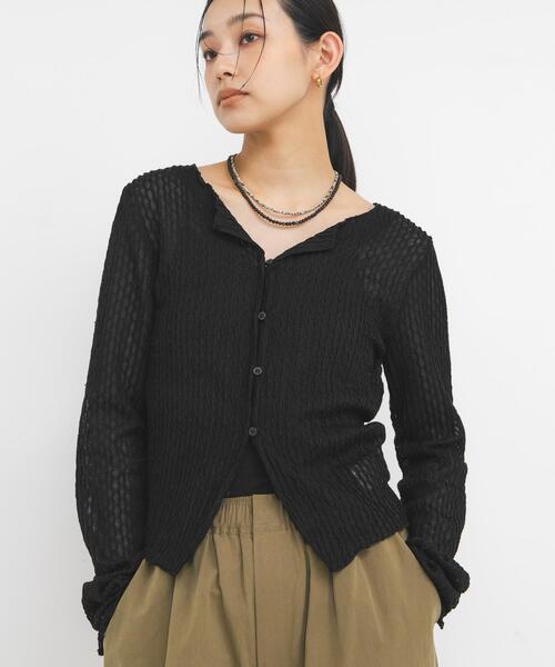 【透かしジャガード素材を使用した女性らしいトップス】 少し柔らかなイメージのある透かしジャガード素材を使用した女性らしいトップス。前開き仕様になっているので羽織としても使用いただけます。程よくコンパクトなサイジングもポイント。前の釦を閉じるとキーネックデザインになっており、抜け感のある着こなしが叶います。 【2026 Spring/Summer】【26SS】 ※強い力がかかると、破れる場合があります。着用時は、他のものとの引っ掛けにご注意ください。 ※商品画像は、光の当たり具合やパソコンなどの閲覧環境により、実際の色味と異なって見える場合がございます。予めご了承ください。 ※商品の色味の目安は、商品単体の画像をご参照ください。 ▼お気に入り登録のおすすめ▼ お気に入り登録された商品は、マイページにて現在の価格情報や在庫状況の確認が可能です。 お買い物リストの管理にぜひご利用ください。 素材感 透け感 : あり 伸縮性 : あり 裏地 : なし 光沢 : なし ポケット : なし One