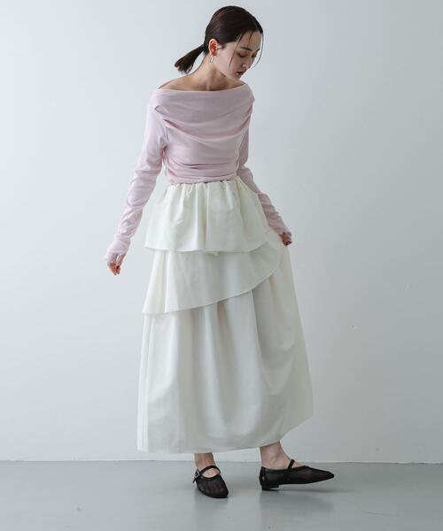 【歩く姿まで美しく。程よいハリ感が導く、洗練されたフレアライン】 ・何層にも重なったティアードデザインが目を惹く、存在感たっぷりの主役級スカート ・広がりすぎず、程よいハリ感のある素材を採用。甘さを抑えたクリーンな佇まいに ・歩くたびにふんわりと軽やかに揺れる、計算されたティアードの重なりがポイント 贅沢なボリュームがありながら、クリアでシンプルな印象を崩さない洗練されたティアードスカート。程よいハリ感を持つ生地が美しいシルエットをキープし、等身大の装いに自分らしい華やぎを添えてくれます。歩くたびに優雅に揺れる裾のラインは、日常の何気ないシーンも特別な瞬間にアップデート。コンパクトなトップスを合わせてスカートの存在感を引き立てる、洗練されたメリハリスタイルがおすすめです。 【2026 Spring/Summer】【26SS】 ※この商品は、縫い目などに過度な力が加わることで滑脱(縫い目が滑って開いたり、縫いしろが抜ける)する場合がありますのでご着用の際はご注意ください。 ※商品画像は、光の当たり具合やパソコンなどの閲覧環境により、実際の色味と異なって見える場合がございます。予めご了承ください。 ※商品の色味の目安は、商品単体の画像をご参照ください。 ▼お気に入り登録のおすすめ▼ お気に入り登録された商品は、マイページにて現在の価格情報や在庫状況の確認が可能です。 お買い物リストの管理にぜひご利用ください。 素材感 透け感 : ややあり(IVORY裏地から下) 伸縮性 : ややあり 裏地 : あり 光沢 : なし ポケット : なし One