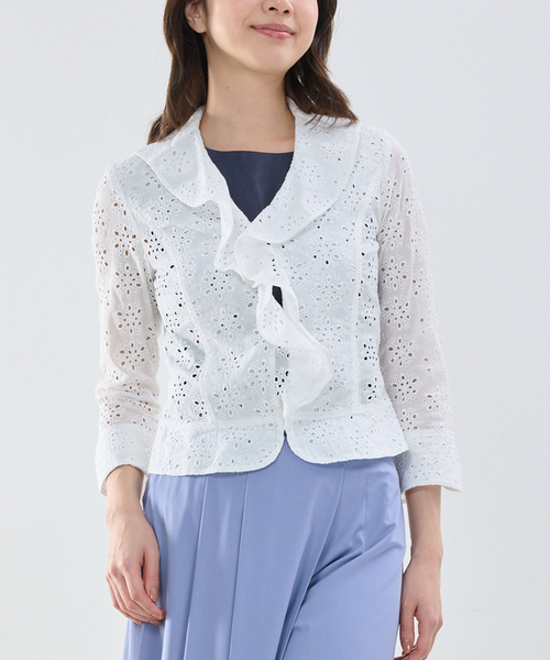コットンのエンブロイダリーレース生地を使用した七分袖ジャケット。フリルディテールを取り入れたナラカミーチェらしいデザインで、初夏の羽織りとして活躍する1着です。涼しげなレース素材は通気性が良く、やさしい肌触りも魅力。タンクトップやカットソー、シンプルなワンピースにさらりと羽織るだけで、上品で華やかなスタイリングに仕上がります。 ・カラー展開はホワイト ・サイズ展開は1(M)9号・2(L)11号・3(2L)13号・4(3L)15号