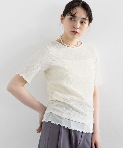 一枚でサマになる、きれいめTシャツ。 ■おすすめの着こなし ☆パンツスタイルには・・・ 甘めなアイテムなので、ベーシックにデニムやスラックスと合わせるのが◎ 上からシャツやベストなどを羽織るのもおすすめです。 ☆スカートスタイルには・・・ 甘めな着こなしにしたい方は、フレアスカートなどを合わせるのが◎ パンツをレイヤードして穿いたりすることで、今年らしい着こなしが叶います。 ーーー ■ポイント きれいめスタイリングにぴったりな一着。 裾にシフォン素材をドッキングしているので、女性らしい印象で着用いただけます。 全面にメロウデザインが施されているので、こなれ感も満載です。 襟はやや広めに開いているので、抜け感があり大人見えも叶います。 サイドにはシャーリングデザインもあしらわれていて、スタイリングもワンポイントになっています。 一枚で着ても、インナーとしても優秀な一着です。 ■素材 伸縮性のあるジャガード生地を使用。 肌触りも良いので、着心地抜群です。