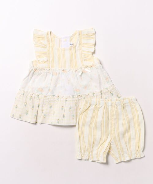 -26SS- ストライプや花柄をふんわり重ねたティアードデザインがとびきり可愛い、女の子ベビー用のワンピースとブルマのセットアップ。 ■デザイン 爽やかなストライプに、やわらかなホワイトベースの花柄レース、そしてカラーごとに異なる花柄生地がふわっと重なるティアードは、動くたびに揺れて、ベビーならではの華やかさとやさしい雰囲気をまといます。 お袖は可愛らしいフリル仕立てで、胸元の切り替え部分には小さなリボンをちょこんとオン。 さりげないアクセントが、着るだけでおめかし気分を高めてくれます。 ブルマは裾がメロウ仕立てで、ふわっと丸みのあるシルエットが可愛いポイントです。 陽だまりのように明るいイエロー系と、ふんわり甘いパープル系の2色展開。 どちらもベビーの愛らしさを引き立てるやわらかな色合いです。 写真映えも抜群で、お出かけや記念日にもぴったりのセットアップです。 ■素材/機能 軽やかな布帛素材を使用し、涼しくさらっと着られるのも魅力。 ワンピースは後ろホックで大きく開く仕様になっており、着替えがぐんとラクに。 ブルマのウエストまわりは総ゴムで、穿きやすくフィットもしやすく、元気に動く日も快適に過ごせます。 ▼お揃い 1801-82572:ワンピース(パープル系) 1815-82746:半袖Tシャツ 1822-82531:セットアップベビー ※柄の出方は生地の裁断により一点一点異なります。 26春夏アイテム 【Sparkle Treasure】 日々の生活の中できらりと光る宝物のようなお洋服をイメージしたコレクション。 【2026 SPRING SUMMER / Wishing you joy-喜びが訪れますように-】 すてきな一日を願う気持ちをお洋服に込めて。 誰かを想うやさしさと、あたたかなぬくもりを感じながら、毎日が小さな幸せで満たされますように。 優しくてあたたかなイメージのコレクション。 【SLAP SLIP(スラップ スリップ)】 ~子どもの欲しいをカタチに~ ヨーロッパのこどものように 子どもらしい今しか着れないナチュラルなかわいさを提案 どこか上品で清楚感漂うフレンチカジュアルは いつものコーディネートをさりげなく格上げ