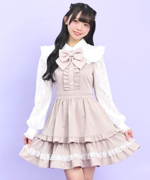 存在感のあるリボンとハートボタンが甘め好きにぴったりなデザイン!ボリューミーな2段ティアードがポイント?レースを重ねた大きなフリル襟は気分で取り外せて雰囲気を変えられる☆