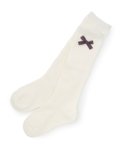 サテンリボンの付いたシンプルなハイソックス。モノトーンカラーでコーディネートに採り入れやすく、丈の短いボトムや、スカートと合わせたスタイリングにおすすめです。