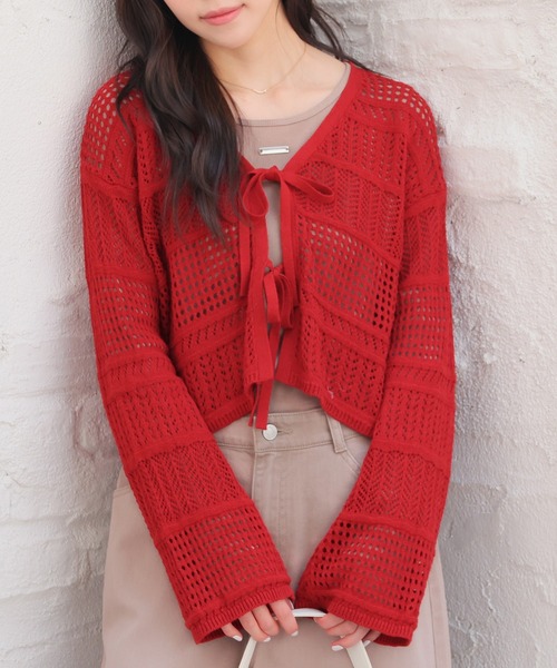 さっと羽織ってガーリーに 【デザイン】 ダブルのリボン使いと透かし編みで今年らしさが詰まったデザイン。 すっきりめの幅×短め丈。 【素材・機能】 さらっとした肌触りの綿麻素材。 【スタイル】 ハイウエストボトムに合わせると好バランス。 タンクトップやキャミをインナーにするのはもちろん、ワンピースに羽織るのも◎ リボンを結ばずに垂らせば、カジュアルな雰囲気に♪ 品番:636-32-1605