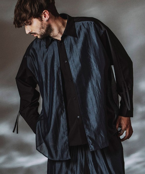 ドローストリングスレイヤードSH 前後身頃にシアー生地をレイヤードする事で奥行きのあるシアー感を演出 袖とシアー生地部分はドローストリングスを調整する事で細やかなドレープを表現 同生地の458006-459Pとのセットアップ対応 オーバーサイズ フロントボタン 袖口カフスボタン ドローストリングス GRAY.PATTERN1 model H:182cm/size one (Overseas model) GRAY.PATTERN1 model H: 180cm /size one (Japanese model) BLACK model H: 170cm /size one (Japanese model)