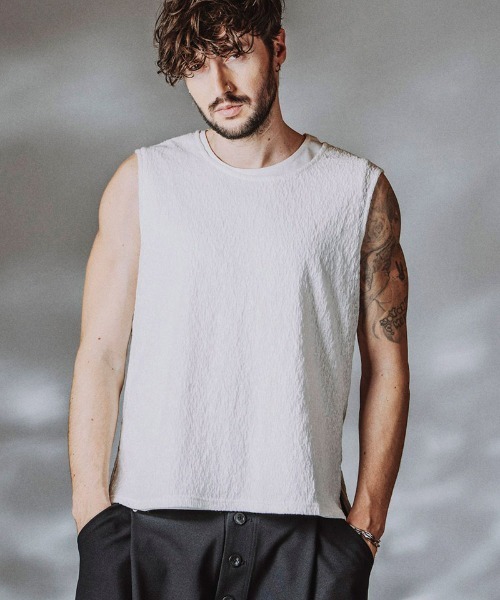 シアーレイヤードスリーブレスPO 伸縮性に富んだテレコ生地と清涼感のあるシアー生地を使用したレイヤードデザインのスリーブレス シャツやジャケットのインナー使いから単体でもサマになるアイテム 2枚セット ノースリーブ シアー生地 テレコ生地 インナー : ONEサイズ/バスト:56cm 肩幅:41cm 着丈:72cm IVORY.GRAY.BLACK model H:182cm/size one (Overseas model) BLACK model H: 180cm /size one (Japanese model) IVORY.GRAY model H: 170cm /size one (Japanese model)