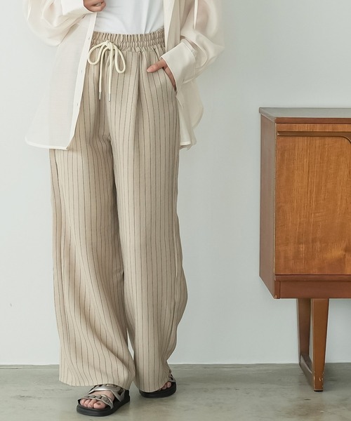 ★ストライプイージーパンツ★ ★素材★ ポリエステル100%のさらりとした軽やかな素材を使 用したパンツです。ほどよいハリ感とやわらかな風合い で、きれいなシルエットをキープします。 ★Detail★ <ウェストゴム> ウェストにはゴムを通しており、しっかりフィットして サイズ感を微調整してくれます。全体のシルエットに強 弱を付けて、ウェストを引き締めて見せるディテールで す。 <サイドポケット> 両サイドにはしっかり収納できるサイドポケットが付い ています。スマホや定期など色んなものが収納できる便 利なディテールです。 ★ポイント★ 縦のストライプ柄がすっきりとした印象を与える、リラ ックス感のあるイージーパンツが登場です。ほどよくワ イドなシルエットで脚のラインを拾いにくく、動きやす さと美しいシルエットを両立しました。 透け感:なし 伸縮性:若干あり 裏地:なし 備考:ウエストゴム ☆気になるアイテムは【お気に入り登録】がおすすめ☆ ▽商品のお気に入り登録 完売カラーの再入荷やラスト1点の通知などを受け取る ことができます。 ▽mili an deniをお気に入り登録 新商品やクーポン、セール情報をいち早く受け取ること ができます。 ※モニター・環境等により実際の商品と多少色味が異な って表示される場合がございます。予めご了承ください ますようお願い致します。