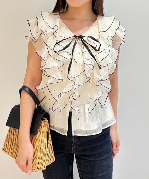 花びらのように重なったフリルが目を引くブラウス。 フロントにたっぷり入ったフリルと細めのリボンデザインがコーデのアクセントになります。 デニムと合わせたカジュアルコーデはもちろん、きれいめパンツやタイトスカートと合わせた女性らしい着こなしもおすすめ。 華やかなデザインでスタイリングを引き立ててくれるブラウスです。 【ご注意】 ※撮影照明の関係により、実際の商品と色味が異なって見える場合がございます。 また、パソコン・スマートフォンなどの環境により、製品と画像のカラーが異なる場合もございます。 予めご了承ください。 ※商品画像はサンプルのため、色味やサイズ等の仕様に変更がある場合がございますので、予めご了承ください。