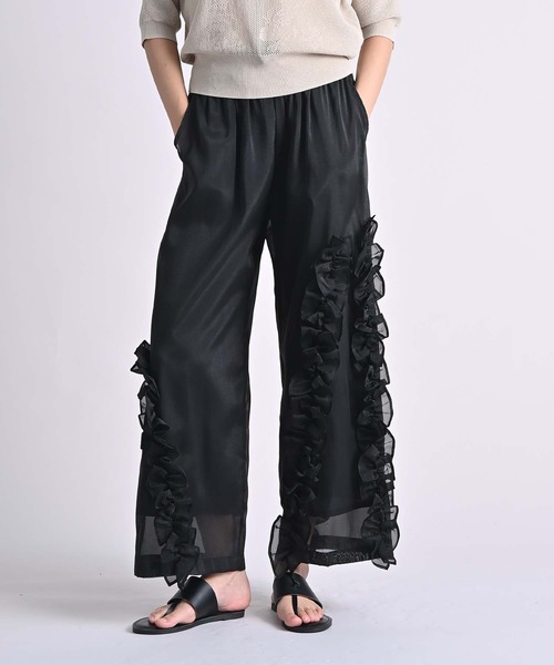 甘さを感じさせないモードなフリルパンツ 【デザイン&ディテールポイント】 アシンメトリーに配したフリルが視線を引きつける、存在感のあるオーガンジーパンツ。 シアー素材ならではの軽やかさが、でパンツ自体を重く見せず、春夏らしい抜け感を演出。 直線的なパンツシルエットに、ランダムなフリルの動きを重ねることで、甘さを抑えたモードな表情に。 フリルが縦ラインを強調し、自然と脚をすっきりと見せてくれるのもポイント。 ウエストはイージーな仕様で、リラックスした穿き心地。 デザイン性がありながらも、合わせるトップス次第で日常にも取り入れやすい一本。 【スタイリングポイント】 シンプルなカットソーやノースリーブトップスを合わせて、パンツを主役にしたミニマムコーデ。 ショート丈トップスやコンパクトなシャツ合わせで、バランスの取れたモードスタイルに。 ■使用上の注意 濃色の物は汗や雨でぬれた時、又は強い摩擦により色移りすることがあります。 濡れた状態での放置、重ね置きをしないでください。 軽く押し洗いをして下さい。 あて布使用。 =========================== 厚み:薄い 伸縮性:なし 裏地:あり 透け感:あり 生地感:普通 洗濯:手洗い可 =========================== 【Anside/アンサイド】 遊び心のあるデザインディティール, 色彩豊かなバリエーションで心躍る毎日を・・・。 自分のスタイルや着こなしを大切にしたい女性におくる大人モードカジュアル。 環境に配慮しつつ、長く大切に着て貰える“タフだけど、ラフ過ぎない”リアルクローズを提案します。