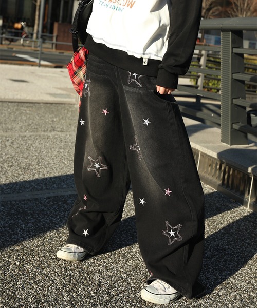 程よくルーズなワイドシルエットが魅力のデニムパンツです。 パンツ全体に散りばめられたスター刺繍がさりげないアクセントとなり、シンプルながらも存在感のあるデザインに仕上がっています。 しっかりとした厚みのあるデニム素材を使用しており、シルエットをきれいに保ちながらも穿き心地は快適。 ワイドなストレートラインで脚のラインを拾いにくく、リラックス感のある着用感が特徴です。 カラーはデニムブルーとブラックの2色展開。 デニムブルーはカジュアルで合わせやすく、ブラックは落ち着いた印象でコーディネートを引き締めてくれます。 Tシャツやスウェット、シャツなど幅広いトップスと相性が良く、デイリーコーデからストリートスタイルまで幅広く活躍する一本です。 公式instagram>>@hook_tokyo 新商品の紹介や、再入荷の情報などは更新中! 【お買いものをお楽しみいただく為に】 ▼商品のお気に入り登録 完売カラーの再入荷通知や、ラスト1点の通知、セールの通知も受け取ることができます。 ▼ブランドのお気に入り登録 新商品や再入荷など、いち早くブランドのお得な情報を受け取ることができます~