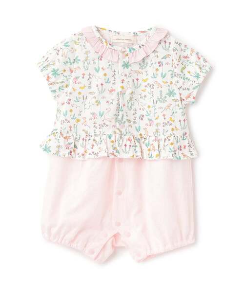 色とりどりの植物や動物たちが魅力的なリバティファブリックス「THEO(セオ)」のロンパースです。 ウエスト回りと衿のフリルで女の子らしさを演出しました。 前全開のスナップボタン仕様なので着脱も簡単。 やわらかな綿100%生地を使用した、赤ちゃんにやさしい肌触りです。 【おすすめの着用時期は春夏シーズン】 【透け感】透けない 【生地の厚さ】普通 【伸縮性】あり