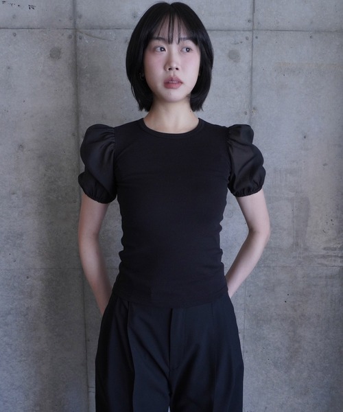 G.V.G.V. (ジーヴィ ジーヴィ)パフスリーブリブトップス 【Fabric】 さらっとした肌触りのハイゲージのフライス素材×細番手を使用したオーガンジー素材。 フライス:微強撚糸を使用することで、ケバ感が少なく綺麗な表情で、清涼感のある生地に仕上がっております。 加工でBAIOすることでよりクリアーな表情と風合いを出しています。 紫外線防止、接触冷感の機能性あり。 伸縮性あり。透け感なし。 オーガンジー:モノフィラメント特有のハリ感と透け感のある素材にヴィンテージ加工を施しています。 シャリッとした清涼感あふれる風合いが特徴的。 【Design】 異素材使いが特徴のパフスリーブリブトップス。 伸びの良いボディに透け感のある袖を付け、より着やすいようにパフのボリューム感や後ろ衿ぐりの開き具合にこだわりました。 後ろ衿ぐりにはポイントとしてDカンが付いております。 タイトサイジング。 G.V.G.V. 桑沢デザイン研究所卒。 カルチャー、音楽のエッセンスと、時代感を表現するブランドとして1999年にスタート。 フェミニンとマスキュリンの同居するオリジナルな世界観と、自由な発想で繰り出すコレクションは、ミュージシャン、アーティスト、ファッション業界などを中心にコアなファンを築いた。ブランドスタートから20年の節目となる2019年より、 素材やシルエットへの更なる拘り、ミニマルとエッジの調和の取れたバランスに注力したコレクションを再考。 ファッションに夢中になって年を重ねてきた女性たちが楽しめる、大人に向けた服とスタイルを提案している。 ※照明等の条件により写真と実際の商品とは色味、サイズ等若干異なる場合があります。予めご了承ください。ご利用いただいているモニターの環境によって色が再現できない場合がございます。
