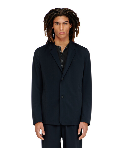 シングルブレストのベーシックなテーラードジャケット「J-ACTIVE」。胸元にはディーゼルのシンボルであるタイニーロゴを同色であしらい、さりげないアクセントにしました。ナイロンストレッチ素材で仕立てた抜群の伸縮性とすべりの良いなめらかな風合いも特徴です。