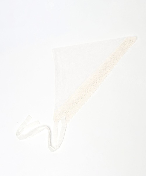 ■デザイン■ レースが涼しげな印象のトライアングルスカーフ。 リボン紐がついているので、頭に巻いたり、ビスチェにしたり、ウエストにワンポイントで巻いたり、多用途で楽しめます。
