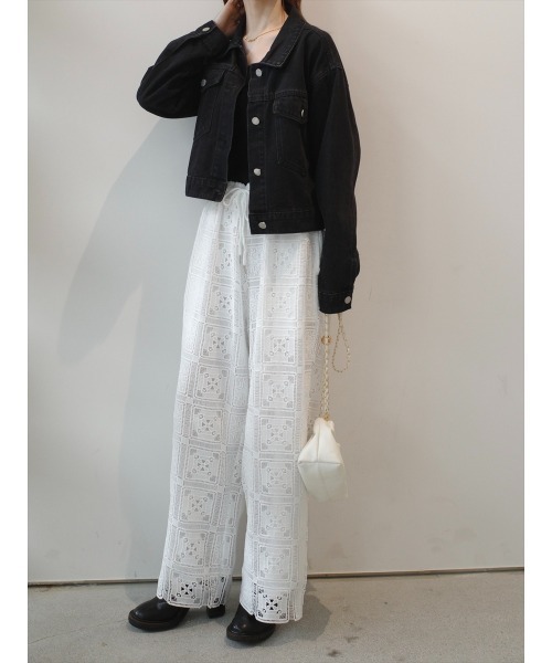 【デザイン&ディテールポイント】 立体感のあるレース素材が目を惹く、ワイドシルエットのイージーパンツ。 繊細なレースを全面に使用し、存在感のあるデザインながらも上品な印象に仕上げた一着です。 スクエアモチーフのレース柄が特徴的で、コーディネートに奥行きと華やかさをプラス。 裏地付きで透け感を気にせず着用でき、レースの軽やかな雰囲気を楽しみながら快適な着心地を実現しています。 ウエストはゴム仕様に加え、ドローストリング付きのイージーデザイン。 リラックス感のある履き心地でありながら、きれいなワイドシルエットが脚のラインを拾わず、すっきりとした印象に見せてくれます。 トップスをインしたスタイルはもちろん、ショート丈トップスやコンパクトなニットと合わせることで、バランスの良いスタイリングが完成します。 カジュアルなTシャツからフェミニンなブラウスまで、幅広いアイテムと相性が良く、コーディネートの主役になるアイテムです。 ホワイト、ブラックの2色展開。 【コーディネートポイント】 コンパクトトップスと合わせてメリハリのあるシルエットに。 ジャケット合わせで大人カジュアルスタイルに。 ブラックトップスでモノトーンコーデもおすすめ。
