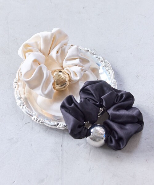 【2026 Spring/Summer】【26SS】 <POINT> ・25AW人気アイテムが素材を変えて再登場! ・艶感サテン×メタルボールの主役級デザイン ・軽やかな素材感で春夏仕様にアップデート ・付けるだけでスタイリングが決まる存在感 【デザイン・シルエット】 ぷりっとした大きなメタルボールが目を引くボールシュシュ。今季はベロアから艶のあるサテン素材にアップデートし、より軽やかで春夏らしい印象に仕上げました。程よいボリューム感で、シンプルなヘアスタイルも一気に華やかに。 【カラー】 ブラックとオフホワイトの2色展開。 ブラック(01):アイボリー×ゴールドボール オフホワイト(15):ネイビー×シルバーボール 【おすすめのスタイリング】 まとめ髪にさっと結ぶだけでアクセントに。ポニーテールや低めのお団子スタイルとも好相性。きれいめ通勤コーデにも、カジュアルなOFFスタイルにもなじむ万能アイテムです。 ※画像の商品はサンプルです。 実際の商品と仕様、加工、サイズが若干異なる場合がございます。