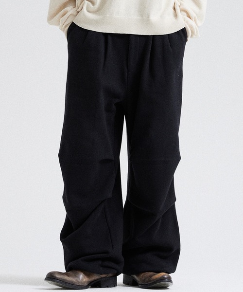 “design/silhouette” ウエストのタックに加え、膝付近に配した2本の横方向タックによって、立体的で奥行きのあるシルエットを構築したタックパンツ。 通常の縦方向タックとは異なり、横方向にタックを入れることで、着用時に自然な溜まり(クッション)を生み出し、他のタックパンツとは一線を画すフォルムを実現しています。 各所のタックが生み出す陰影が、スウェットパンツでありながら洗練された印象を与え、デザイン性と日常使いのしやすさを両立。 ラフに見えがちなスウェット素材を、モダンで都会的なスタイルへと昇華しています。 裾にはスピンドルコードを内蔵し、絞ることでシルエットの変化を楽しめる2WAY仕様を採用。 ワイドシルエットとしてリラックス感を演出するスタイルから、裾を絞った軽いジョガーパンツライクな着こなしまで、トップスやシューズに合わせて自在に調整可能です。 ウエストは総ゴム仕様に加え、スピンドルコードで細かなフィット感の調整が可能。 さらにベルトループも備えており、スタイリングの幅を広げています。 フロントには信頼性の高いYKKファスナーを使用。 サイドスラッシュポケット2箇所、バックポケット2箇所の計4ポケットを搭載し、機能性も確保した実用的な一本に仕上げています。 “material” 表糸26番手、中糸26番手、裏糸8番手を使用した、目付400gのヘビーウェイト裏毛素材を採用。 表面は細番手による滑らかで整った目面を持ち、カジュアルになりすぎないクリーンな印象に。 裏面には太番手の糸を用いることで、大きく膨らみのあるループを形成。 ボリューム感と適度な保温性を備え、シルエットに立体感を与えます。 綿100%ならではの柔らかな肌触りと、ナチュラルな風合いも魅力。 日常使いに適した快適性を持ちながら、厚手ならではのタフさを兼ね備えた素材設計です。 デザイン性と快適性を両立した、ワードローブの新たな軸となるスウェットタックパンツに仕上がっています。 ご使用上のお願い ·生成り、淡色は蛍光増白剤禁止 ·つけ置き禁止 ·洗濯ネット使用 ·形を整えて干す ·アイロン時はあて布使用 ·濃色と淡色は分けて洗う ·摩擦(特に湿った状態での摩擦)や雨·汗などで、他の衣料やバッグ等の周りのものに色移りすることがありますのでご注意ください。 ·洗濯後は直ちに干してください。 ·この製品は、直射日光等により退色·変色する事がありますので、お取り扱いにはご注意ください。 “Parts Lab./パーツラボ” “Optimization the basics” ベーシックを“部品”として設計するアパレルブランド。 余計を削ぎつつ必要を満たし、サイズ精度と素材整合で組み合わせるほど装いの完成度が上がる土台を提供する。 “注意事項” お手入れやお洗濯はタグなどに記載されている「取り扱い上の注意書き」や、本体内側に付属している「洗濯表示」を必ずご参照下さい。 △商品のお気に入り登録▽ 完売カラーの再入荷通知や、ラスト1点、セールの通知をお知らせいたします。 ▲ブランドお気に入り登録▼ 新商品や再入荷など、いち早くブランドの情報を受け取ることができます。