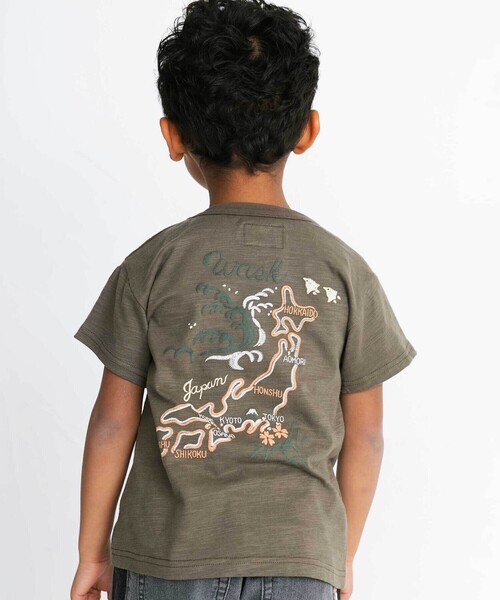 -26SS- 小生意気キッズの、日本縦断スタイル。 ■デザイン アーカイブの“スカジャン風日本地図”を、発泡プリントで立体的に仕上げた特別デザイン。 刺しゅうのような奥行きと、子ども服らしい遊び心を両立した一枚です。 レッド(エンジ)はネイビー×ホワイト×グリーンの配色でアメリカンテイストを表現。 グリーン(オリーブ)はイエローやオレンジを効かせ、アウトドアムード漂う自然な印象に。 どちらの色も、着るだけで男の子らしいかっこよさが際立つ存在感のあるカラーリングが魅力です。 ■素材/機能 通気性が良く、ほんのりヴィンテージ感のあるスラブ天竺を使用。 肌あたりがやわらかく、汗ばむ季節も快適に過ごせるコットン100%素材です。 刺しゅう風プリントにすることで肌への刺激をなくし、幼稚園や小学生のデイリーシーンにも安心。 動きやすく、アクティブな男の子の毎日にしっかり寄り添います。 WASKらしい遊び心と機能性を兼ね備えた、30周年ならではの特別な一枚です。 26春夏アイテム 【 WASK(ワスク)】 WEEAGEDSAUCYKID「我々は小生意気な子供である・・・」 自由で遊び心満載な男の子たちへ アメリカンテイストをベースにその時々のトレンドや異なる要素をプラス エッジの効いたカジュアルスタイルをキッズウェアで表現