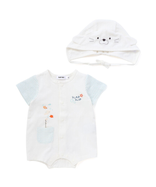 -26SS- カラーごとにちがうモチーフが楽しめる、ベビー用のロンパースと帽子のセット。 ■デザイン 袖やフロントのポケットには爽やかなストライプ柄を取り入れ、夏らしい清涼感とベビーらしい可愛らしさをぎゅっと詰め込んだデザインです。 ポケットからはチンアナゴやメンダコ、アザラシがちょこんと顔をのぞかせ、見ているだけで思わず微笑んでしまう遊び心も添えています。 ホワイトはアザラシがテーマ。 ロンパースの後ろにはぷっくり可愛いアザラシのお顔がついていて、ハイハイする後ろ姿までとびきりキュート。 帽子をかぶると、まるでアザラシがすいすい泳いでいるように見える、とっておきのデザインです。 オレンジはメンダコがテーマで、ロンパースのお尻部分にはメンダコのパッチをオン。 帽子はかぶると、ちょうど頭の上にメンダコがちょこんと乗っているように見えて、思わず写真を撮りたくなるような可愛さです。 海の仲間たちと一緒にお出かけしている気分になれる、遊び心たっぷりのアイテムです。 ■素材/機能 やわらかい天竺生地を使用しており、赤ちゃんの肌にそっと寄り添う着心地。 前はホック仕様で大きく開くので、着替えもとってもスムーズ。 さらに股下だけを開けられる仕様で、オムツ替えもラクにできるのがうれしいポイントです。 ※柄の出方は生地の裁断により一点一点異なります。 26春夏アイテム 【Sparkle Treasure】 日々の生活の中できらりと光る宝物のようなお洋服をイメージしたコレクション。 【2026 SPRING SUMMER / Wishing you joy-喜びが訪れますように-】 すてきな一日を願う気持ちをお洋服に込めて。 誰かを想うやさしさと、あたたかなぬくもりを感じながら、毎日が小さな幸せで満たされますように。 優しくてあたたかなイメージのコレクション。 【SLAP SLIP(スラップ スリップ)】 ~子どもの欲しいをカタチに~ ヨーロッパのこどものように 子どもらしい今しか着れないナチュラルなかわいさを提案 どこか上品で清楚感漂うフレンチカジュアルは いつものコーディネートをさりげなく格上げ