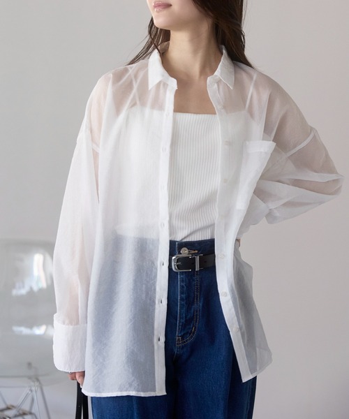 ◆程よい透け感が今年らしいシアーシャツ◆ 軽やかなシアー素材で仕立てた、トレンド感のあるオーバーシャツをリリースしました。デート、ご旅行、アミューズメントパークからオフィスカジュアルでビジネスまで幅広く着回しの出来るシャツブラウスです。 ◆Design◆ ヒップが隠れる長めの着丈で、さらっと羽織るだけで抜け感のあるスタイリングが完成します。 ほどよい透け感なので、タンクトップやキャミソールと合わせたレイヤードスタイルもおすすめ。 春から夏、秋口までロングシーズン活躍する万能アイテムです。 デニムやスラックス、スカートなど幅広いボトムと相性がよく、カジュアルにもきれいめにも着回しが可能。 前を開けて羽織りとしても使える、春夏シーズン1枚あると便利なシアーシャツです。 ◆Styling◆ タンクトップ×デニム、キャミワンピースの羽織り、スラックス合わせのきれいめコーデはおすすめです。 ◆Design point◆ シアーシャツ / シアーブラウス / シースルーシャツ / シアートップス / オーバーシャツ/ 羽織り / 長袖シャツ / 春シャツ / 夏シャツ / レイヤード/ ◆color◆ オフホワイト / ブラック ◆Size◆ 着丈:79cmヒップが隠れる丈感のオーバーサイズシルエット。 ◆素材◆ ポリエステル63% ナイロン37% 洗濯:ドライクリーニング