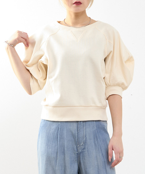カジュアルながら、ボートネックとふんわりとした袖のボリューム感が女性らしさを引き立てる、1枚で映えるトップス。 クリアな目面とハリのあるタッチが特徴のきれいめ裏毛素材を使用し、カジュアルすぎず上品な印象に仕上げています。 デニムやスカート、ワイドパンツなど、どんなボトムともバランスよくコーディネートできる万能スウェットです。