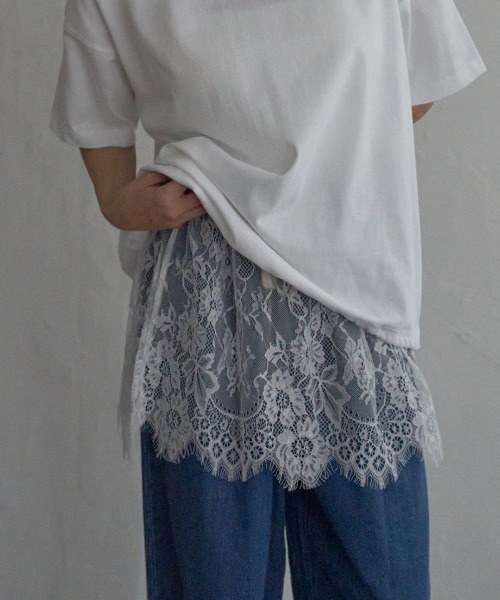 いつものコーデにプラスするだけで即トレンドのレイヤードスタイルが完成! 品のある繊細なレースデザインでコーデが一気に華やぎます。 【Detail】 ウエストのゴム仕様で、レイヤード部分の長さも合わせるトップスの長さに合わせて調節可能。 どんなトップスにも合わせやすく、甘すぎないデザインで大人っぽくもカジュアルにも着回しのできる一枚。 春のトレンドコーデの必須のアイテム♪ 【Color】 オフホワイト、ブラック 【Coordinate】 Tシャツやスゥエットにデニムを合わせてカジュアルにも。 テーパードパンツなどきれいめのボトムにも合わせて大人っぽくも着れる 合わせやすいデザインです。 付け裾としてレースキャミソールをインナーに着ているようなスタイリングが簡単にできます! 軽いレースデザインなので夏でも使いやすく、タンクトップやキャミソールとのレイヤードもおすすめ!
