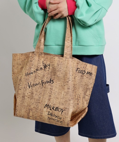 MILKBOY 2026 SPRING ・コルク柄のテキスタイルに、手書き風のメッセージやロゴがプリントされた、ユニークで遊び心のあるデザインのトートバッグ ・荷物が多い日やちょっとした旅行にも対応できる抜群の収納力! ・ナチュラルなコルクの風合いとストリートライクなロゴが融合し、シンプルな装いにも映える、個性的なファッションアイテムとして◎ ~ Color ~ A,ベージュ ~ Size ~ 幅(W) 52㎝ / 高さ(H) 43㎝ ~ Material ~ 合成皮革